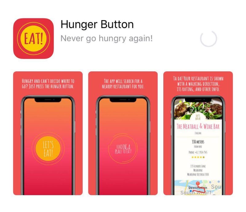 他的另一個作品更神奇,名叫 Hunger Button。打開之後會出現漸層色紅底,上面有一個黃色按鈕,只要按一下,App 就會隨機推薦一家你周圍的餐廳,且推薦界面只有一張餐廳招牌菜圖、餐廳店名、步行距離、餐廳電話和餐廳星級,非常簡潔!還用了漂亮的手寫字體!如果你不滿意這家餐廳,還可以繼續抽,直到抽到滿意的為止。