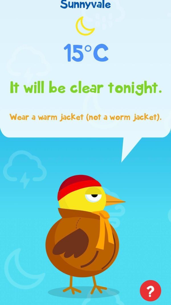 尤馬開發的另外一款鴨子系列 App 是最可愛的天氣應用軟體。軟體裡有一隻玩變裝秀的小鴨子(應該是那隻蓋大樓的小鴨子下班了),每天牠都會穿上適合今天天氣的衣服,然後說一句冷笑話……例如:今日桑尼維爾夜間天氣 15 度、有點風,鴨子就會建議你穿一件暖和(warm)的外套,而不是小蟲(worm)外套。就是小學生講的笑話啊!而且戳一下小鴨子,還會傳來尤馬自己錄的嘎嘎叫聲!