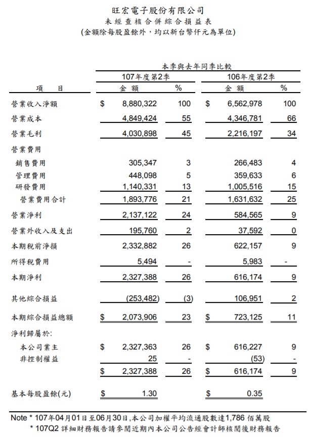 受惠有利的產品組合,與產品維持不錯價格,旺宏第 2 季毛利率攀高至 45%,較第 1 季拉升 3 個百分點,稅後淨利攀高至新台幣 23.27 億元,季增 24%,每股純益 1.3 元。