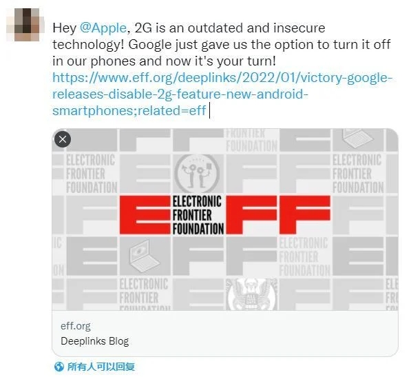 電子前哨基金會 2020 年起便一直呼籲停用過時的 2G 蜂巢式網路,Google Android 系統更是一年多來第一個允許用戶完全禁用 2G 網路的行動操作系統。EFF 還在 Twitter 發起聲援行動,對象自然就是 iOS,希望蘋果跟 Google 一樣,幫 iOS 加上 2G 網路開關。