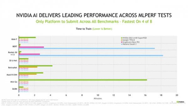 在本次基準測評結果中,NVIDIA A100仍然保持了其單晶片性能的領導者地位,在8項測試中,有4項取得最快速度的成績。