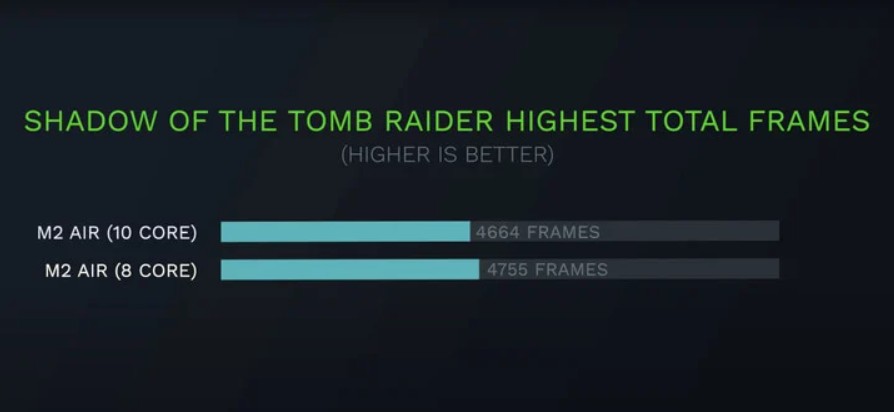 GregsGadgets 測試,同樣跑《古墓奇兵》遊戲,8 核心 GPU 基礎版成績略勝 10 核心 GPU 高配版,就是因散熱不佳,使 10 核心 GPU 積熱更多,故更快進入降頻。MaxTech 連續使用 CineBench R23 跑分極端情形,M2 MacBook Air 的 CPU 從 3.2GHz 主頻降至 2.65GHz,核心溫度也飆升到 94℃。