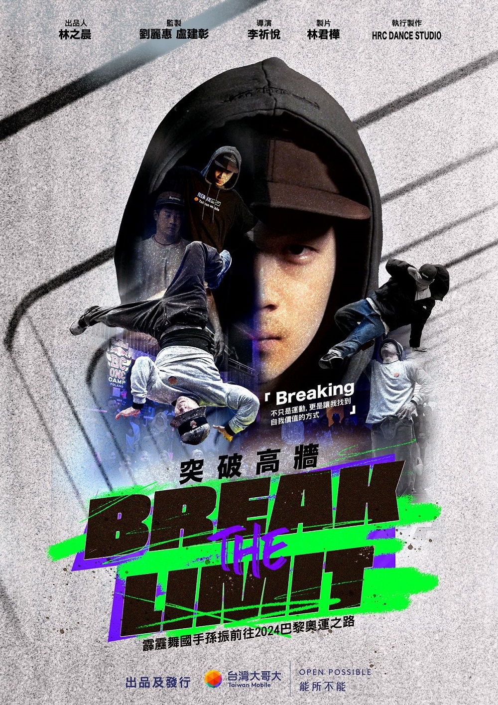 台灣首支霹靂舞國手紀實片《Break the Limit 突破高牆》今(25)日熱血上映。台灣大哥大今天發布「勇敢追夢」專案的最新成果,由第 14 屆 myfone 行動創作獎微電影百萬首獎李祈悅導演一手包辦企劃、執導、剪輯,耗時近兩年的時間,紀錄台灣大體育家族霹靂舞選手孫振努力奮鬥,以前進奧運為目標,熱血追夢的故事。