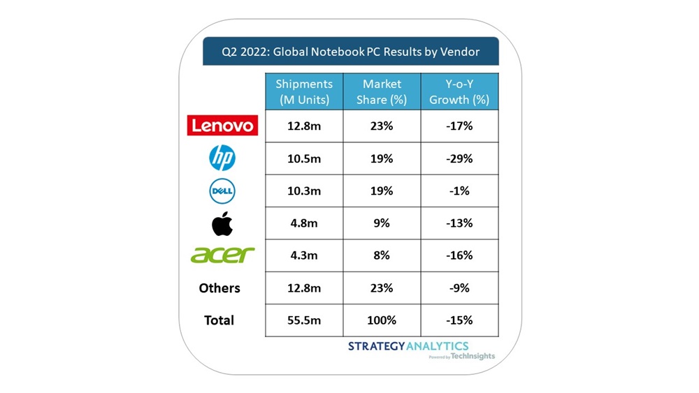 IT 之家報導,Strategy Analytics 報告指出,2022 年第二季全球筆電出貨量年減 15%;出貨量前五位分別為聯想、惠普、戴爾、蘋果、宏碁。Strategy Analytics 認為,儘管有挑戰,但對於所有廠商而言,筆電銷量和平均售價相較疫情前要好得多,此一趨勢也將繼續。