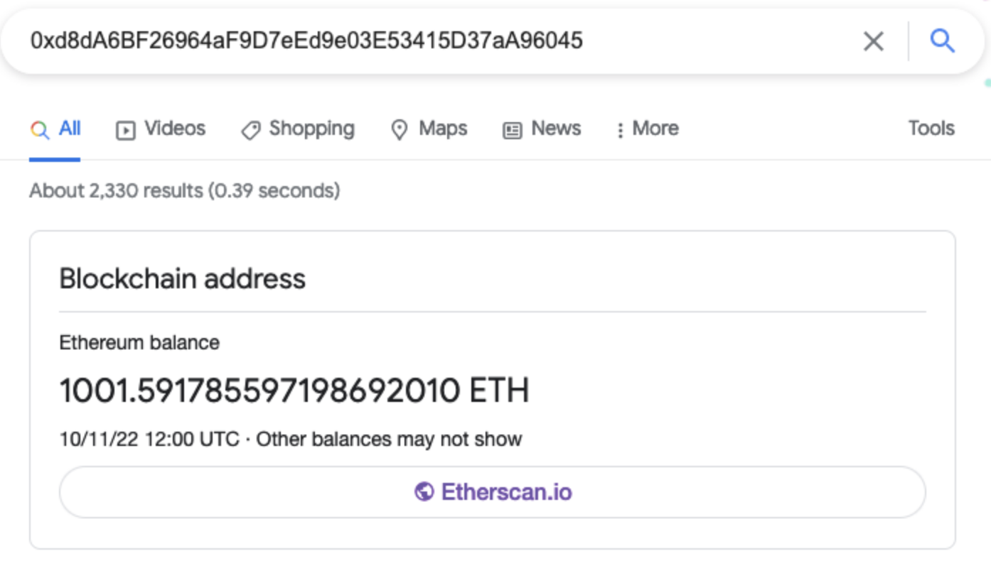 Google 搜尋引擎似乎可直接顯示以太坊錢包餘額