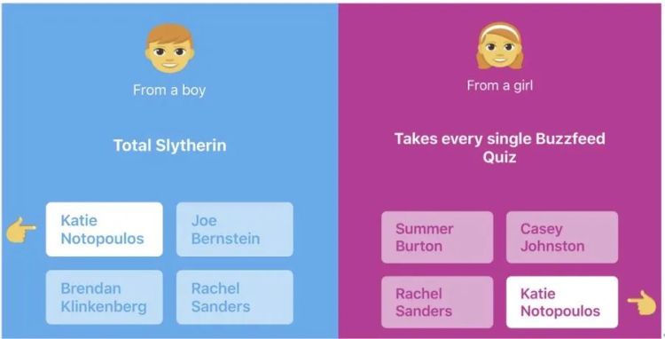 使用者可選擇問題都是設定好的,使用者不能更改,清一色是「誇誇問題」,如「你認為誰是運動健將?」「誰的笑容最美?」「誰的穿搭最棒?」「你最喜歡誰的萬聖節裝扮?」等。