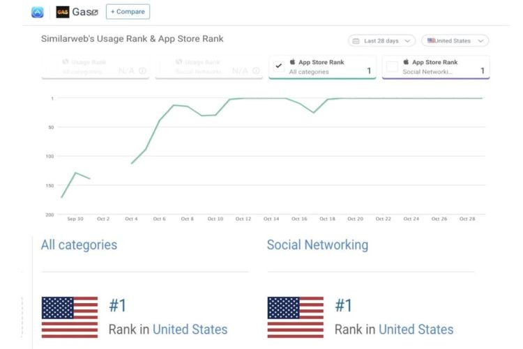 雖然Gas才開放美國十幾州試點,但10月後Gas在美國各大校園「病毒式」傳播,牢牢占據蘋果商店下載榜第一名,TikTok、Instagram都甩在身後。