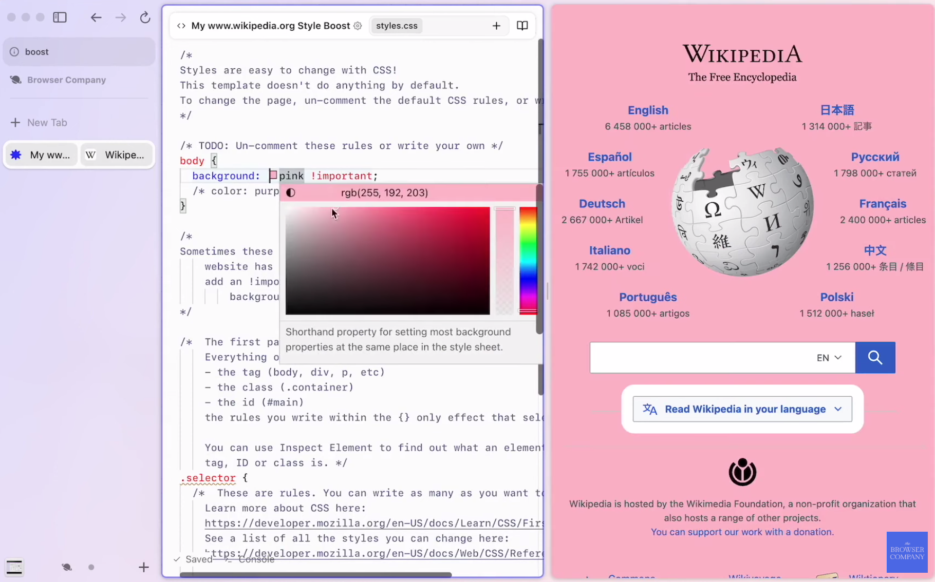 Boosts給予具工程能力的使用者,讓用戶修改網站程式碼,自定義網站樣貌,例如下圖將維基百科白色背景換成粉色背景。