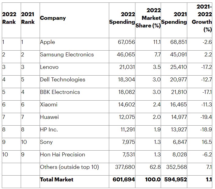 顧能調查,聯想(Lenovo)去年半導體採購金額210.31億美元,居第三位;戴爾(Dell)採購金額183.04億美元,排第四名;步步高採購金額180.82億美元,居第五位;小米採購146.02億美元,第六名;華為採購120.75億美元,位居第七。
