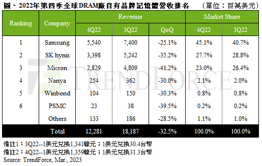 營收方面,三星(Samsung)、SK海力士(SK Hynix)、美光(Micron)營收均明顯下滑,在第四季的價格戰中,三星讓價態度最為積極,因此在需求衰退之際,出貨不減反增,儘管營收金額來到55.4億美元,季跌25.1%,衰退幅度是三大原廠中最低。SK海力士營收34.0億美元,季跌35.2%,由於適逢2022年財報年底,韓廠積極加大出貨力道,但因產品價格跌幅劇烈,使得營收面臨衰退。美光28.3億美元,季跌41.2%,因財報區間早於其他供應商,出貨量跌幅較大,故營收衰減幅度為眾原廠之中最劇。受營收劇跌影響,各原廠去年第四季營業利益率快速下跌,預期2023年第一季將由正轉負。