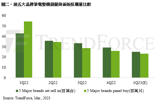 筆電面板庫存去化的程度可以從筆電品牌(不包含蘋果)的整機銷售與面板採買的觀點來看。根據我們的觀察,