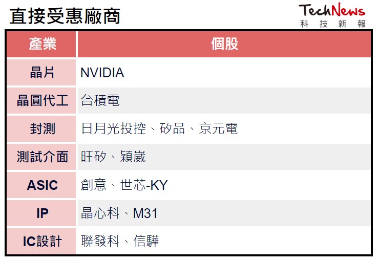 如果觀察與ChatGPT相關的關鍵字與相關主題,其概念股與使用方式受到的矚目程度最高,但要回答哪些產業與股票會受到ChatGPT與生成式AI趨勢帶動,依IDC資深研究經理蔡宜秀的判斷來看,無庸置疑投資ChatGPT背後團隊Open AI的微軟(Microsoft)最受惠,而硬體上讓AI能夠擁有相當人腦運算能力的晶片廠商,且在AI領域遙遙領先的NVIDIA也不應錯過,蔡宜秀指出,NVIDIA已經對客戶開放生成式AI的雲端解決方案,可以想見在第二季、第三季會有許多產業對生成式AI有好奇心進而投入研發與測試,國內NVIDIA供應鏈也會同步受惠。譬如高速運算(HPC)晶片代工領域的龍頭台積電會受惠是想當然爾的,IC設計廠商也不會缺席,而間接受惠的族群還有伺服器、散熱。