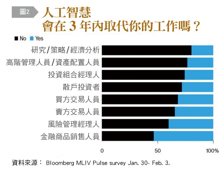 目前最熱門的問題是,金融人員是否會被ChatGPT取代?根據美國彭博社的調查,三分之二的金融人員認為自己在未來3年還不會被取代。大部分的人認為,AI最終會取代部分財務、公關媒體、法務和科技類的工作。至於策略性研究、經濟學家和市場投資交易人員的工作性質,依賴相當高比例的個人判斷,目前感受不到AI的威脅,但對於一般金融產品的銷售人員、風險評估人員來說,認為相較其他人員,未來被AI取代工作的可能性最大。