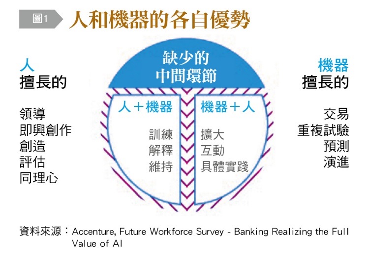 根據Accenture關於銀行使用AI的價值報告分析,未來金融人員的訓練要專注於銜接人員與機器之間的斷層,也就是培養自己善用AI的能力。充分了解AI能提供的功能與專長(處理交易,進行重複、預測、進化),與人腦的專長(領導、創造、判斷、同理、即興演出)之間如何有效的合作,用這樣的原理演繹出每個現有職位新的職能。例如,原本專注於充分了解每位客戶(KYC)背景資料的櫃員,工作內容轉變成利用AI的分析,找出不正常的資訊,包含可能造假的個人資料或交易,工作性質從單一的資料輸入變成分析和評估風險。