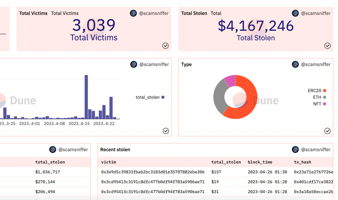 據 Scam Sniffer 統計數據,目前一共有約 416 萬美元資金被盜,3,000 人受害,大部分被盜事故發生在最近的一個月內,被盜資金中,有些存進了 SimpleSwap、Tornado.Cash,有些則直接存入 KuCoin 、幣安等交易所。