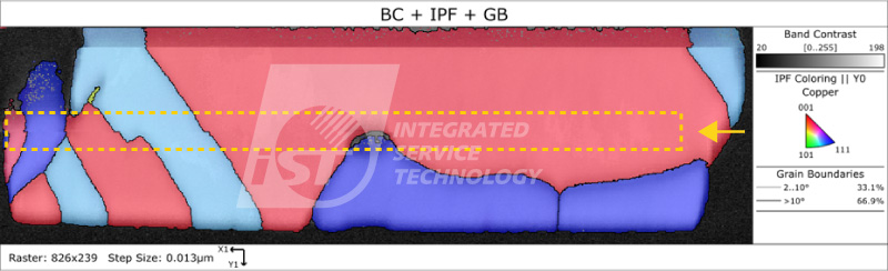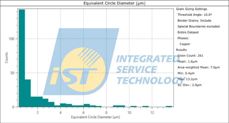 圖一可得知晶界角度大於 10 度的比例為 94%,表示其晶粒取向差異較大,可能較不利於抗電遷移;圖二為統計其銅柱晶粒尺寸的結果,其平均粒徑為 1.6um,粒徑及取向數據需要再進一步比對及分析。不過綜合兩個結果,意味著銅柱可能不具有較好的抗電遷移能力。宜特材料分析實驗室建議,研究者可根據這樣的結果,進一步採用高溫高濕(HTH)和恆電壓(HVM)等分析,測試其抗電遷移能力。