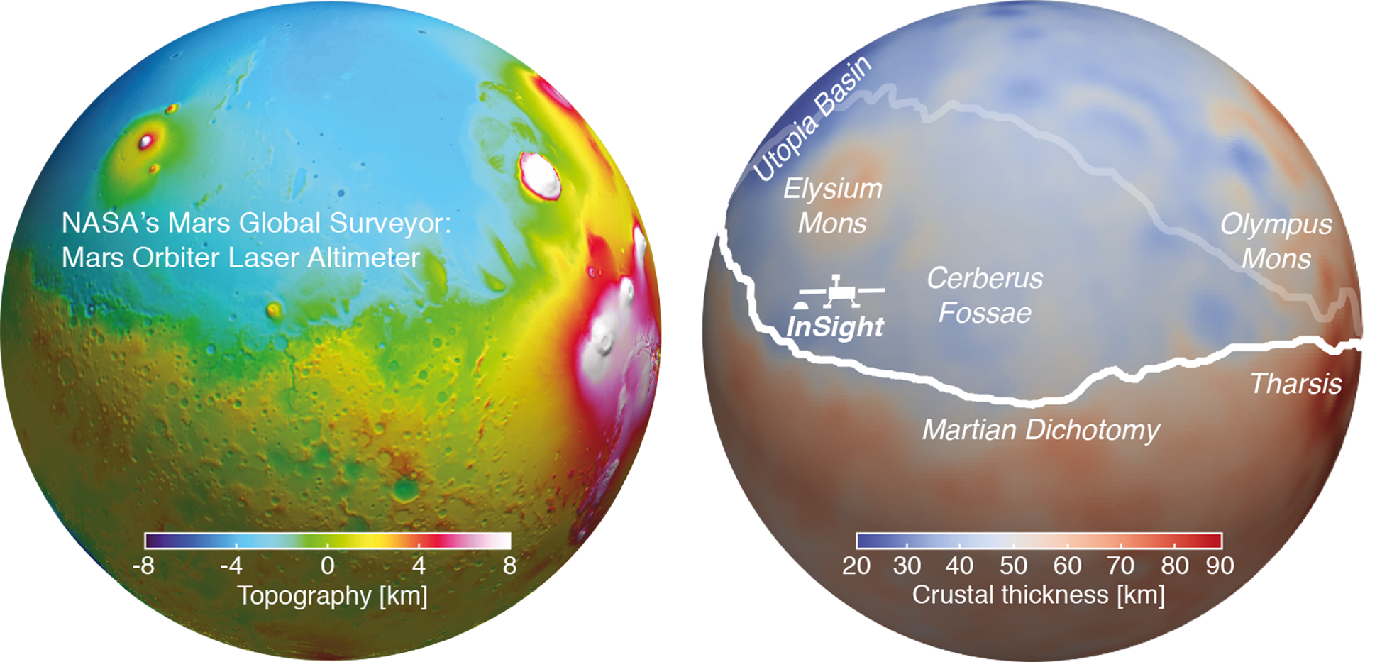 將結果與火星重力和地形數據結合,能確定火星地殼厚度為平均42~56公里。地殼在伊希斯撞擊盆地(Isidis impact basin)最薄,約10公里,塔爾西斯地區(Tharsis province)最厚,約90公里。地球地殼平均厚度為21~27公里,阿波羅任務地震儀測定的月球地殼厚度約34~43公里。