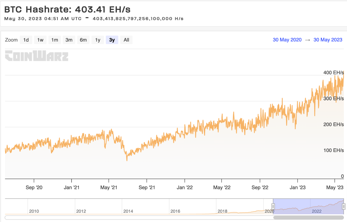▲ 比特幣算力三年來呈現攀升趨勢。(Source:CoinWarz)