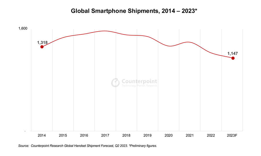 CNBC等外媒報導,根據Counterpoint 8月17日最新發表的全球手機出貨量預測,2023年智慧型手機出貨量將衰退6%,下滑至11.5億支,創十年來最低紀錄,主要受主力市場中國和美國銷量不振所拖累。