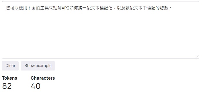中文為:「您可以使用下面的工具來理解API如何將一段文本標記化,以及該段文本中標記的總數。」共82個Token。