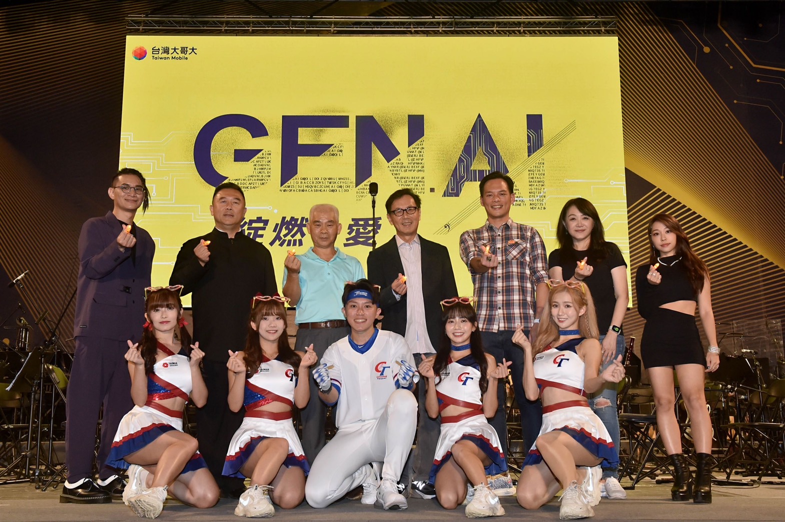 ▲ 台灣大哥大日月潭花火音樂會以「Gen. AI 綻燃 ‧ 愛」為題,今(21)日展開,台灣大董事長蔡明忠(二排右四)、總經理林之晨(二排右三)共襄盛舉,準歌后接班人艾薇、實力唱將卓義峯輪番登場。(Source:台灣大哥大)