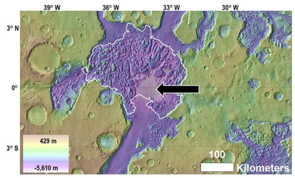 ▲ 探測衛星拍攝火星地形圖,白線圈起Hydraotes Chaos區域,含黑色箭頭所指可能是史前泥漿湖的位置。(Source:Space.com)