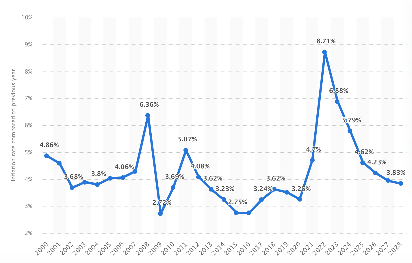 ▲ 過去二十餘年全球通膨率走勢。(Source:statista)