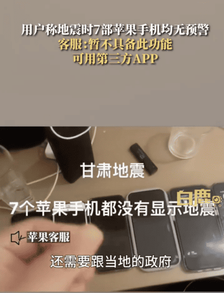 甘肅 6.2 級地震,震源深度 10 公里,多地網友都經手機收到地震警報,但網路流傳影片網友抱怨,七支 iPhone 未收到地震通知。詢問蘋果客服回答:「地震預警需和當地政府申請,暫時性的話可下載第三方預警 App,系統工程師會收集客戶需求後改善。」