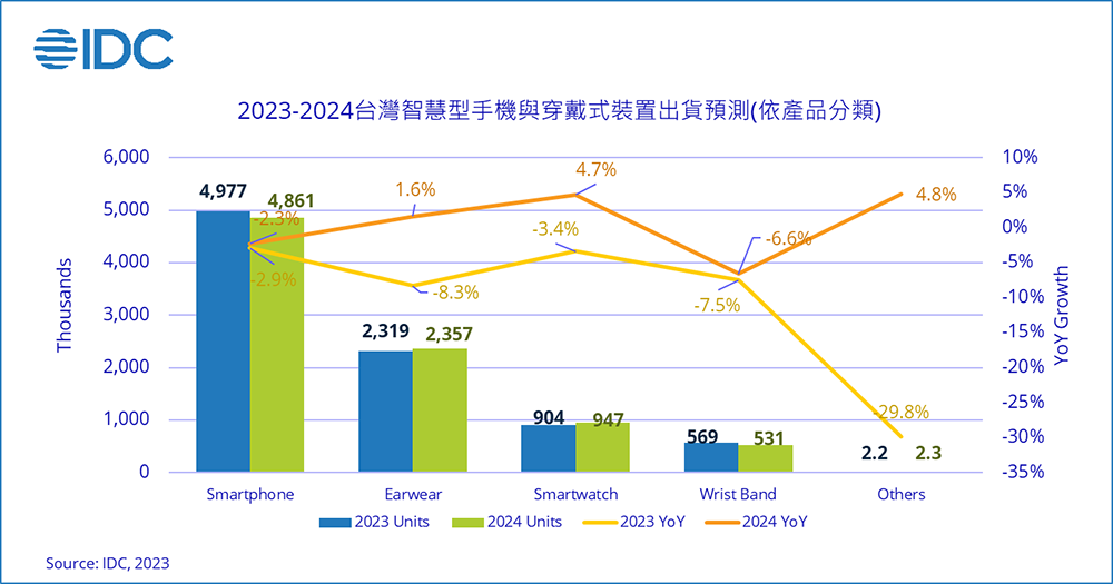 IDC助理市場分析師江靖婷表示,預期2024年台灣智慧型手機市場將持續受到經濟環境及消費者換機週期拉長影響,全年出貨台數下跌2.3%至486萬台;而ASP也將因匯率、成本提升及手機原廠資源集中在中高階產品的因素而有2.2%的成長;台灣穿戴市場明年整體將成長1.1%至384萬台,其中智慧手錶將成長4.7%至95萬台。