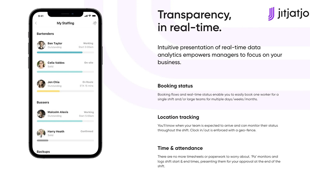 自Jitjatjo創辦人Tim Chatfield離開AWS的職務,2015年正式創立Jitjatjo後,至今市場上已超過4萬名零工,以及醫療、酒店、教育和零售領域的業者使用Jitjatjo的匹配演算法媒合工作,用戶遍布澳洲和美洲各省。