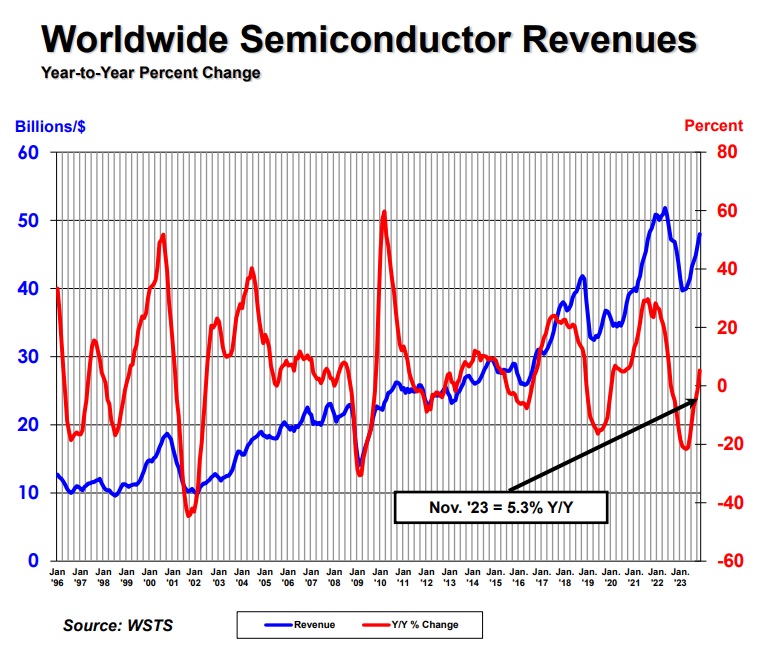 美國半導體產業協會(SIA)統計,2023 年 11 月全球半導體銷售額 480 億美元,年增 5.3%,為 2022 年 8 月以來首度較前一年同期成長,並預期 2024 年全球半導體銷售額可望成長 2 位數百分比。