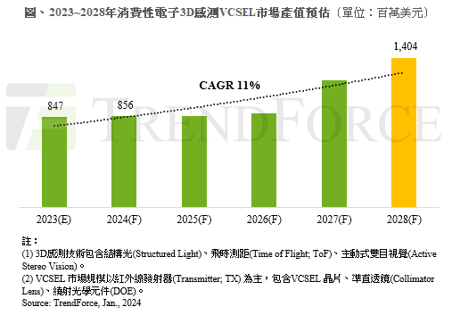 而隨著 Apple Vision Pro 將於 2024 年正式出貨,採用結構光(Structured Light)、直接式飛時測距(dToF)、主動式雙目視覺(Active Stereo Vision),共三項 3D 感測技術。加上 Sony、Meta、Microsoft、Google 等品牌廠商持續推出擴增/虛擬實境產品,也將穩定帶動 3D 感測市場需求。預估至 2028 年消費性電子 3D 感測 VCSEL 市場產值上看 14.04 億美元,2023~2028 年複合成長率約 11%。