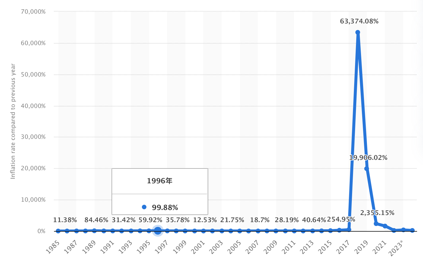 2023 年委內瑞拉物價上漲 193%,2022 年通膨率為 186%。早在 2017 年委內瑞拉通膨就已失控,較前一年漲四倍多。那年後因委內瑞拉經濟崩潰,只能透過估計計算通貨膨脹率,外界估算 2019~2021 年委國通膨率都是四位數上漲。