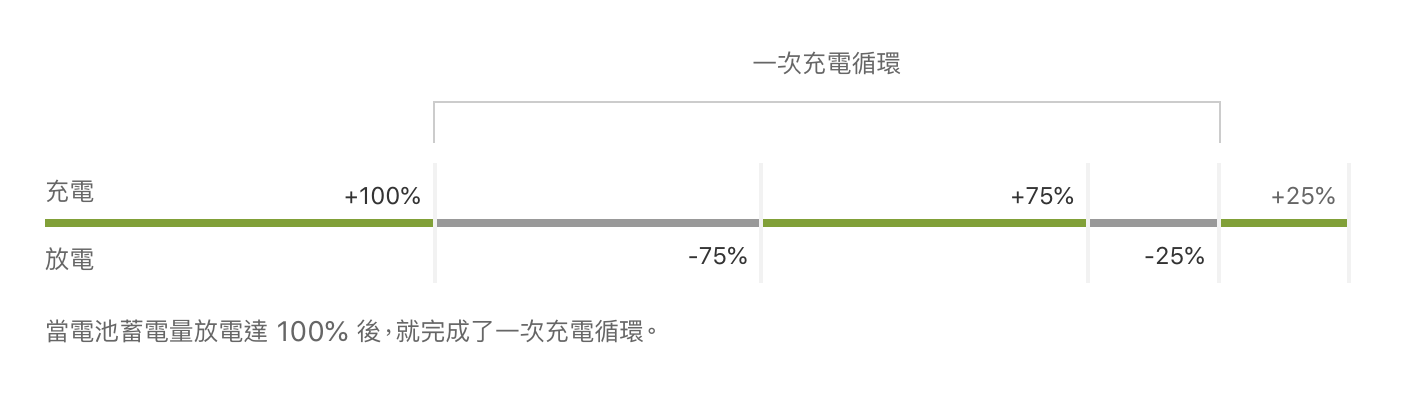 何謂「完整的充電循環」?據蘋果官網解釋,蘋果鋰離子電池是以充電循環的方式運作,當你使用(放電)的電量相當於 100% 的電池蓄電量時,就完成了一次充電循環,但不一定所有的蓄電量均來自同一次的充電。