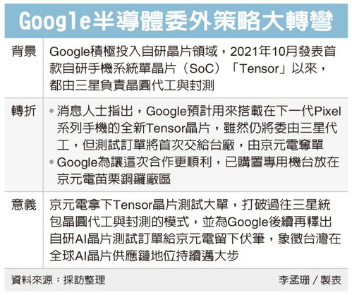 Google踏入自研晶片領域,與三星密切合作。因應自家手機Pixel需求,Google在2021年10月發表首款自行研發的手機系統單晶片Tensor,由三星以5奈米製程生產並統包封測訂單。Google後續世代的Tensor晶片維持由三星代工與封測統包策略,製程推進至4奈米。消息人士指出,Google下一代Pixel系列手機全新Tensor晶片雖仍由三星代工,但測試訂單首次交給台廠,由京元電奪單。