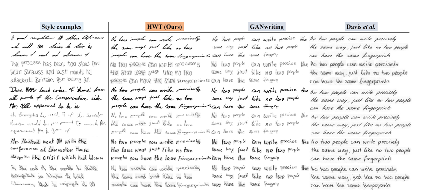 ▲ 穆罕默德·本·紮耶德人工智慧大學實驗室科學家將他們的手寫文字圖像生成方法(簡稱 HWT)與其他兩種手寫生成技術 GANwriting 和 Davis 比較。三個生成器都被指示生成相同文本,並且接受六位不同作者的手寫文字樣本(最左欄)的訓練。(Source:穆罕默德·本·紮耶德人工智慧大學