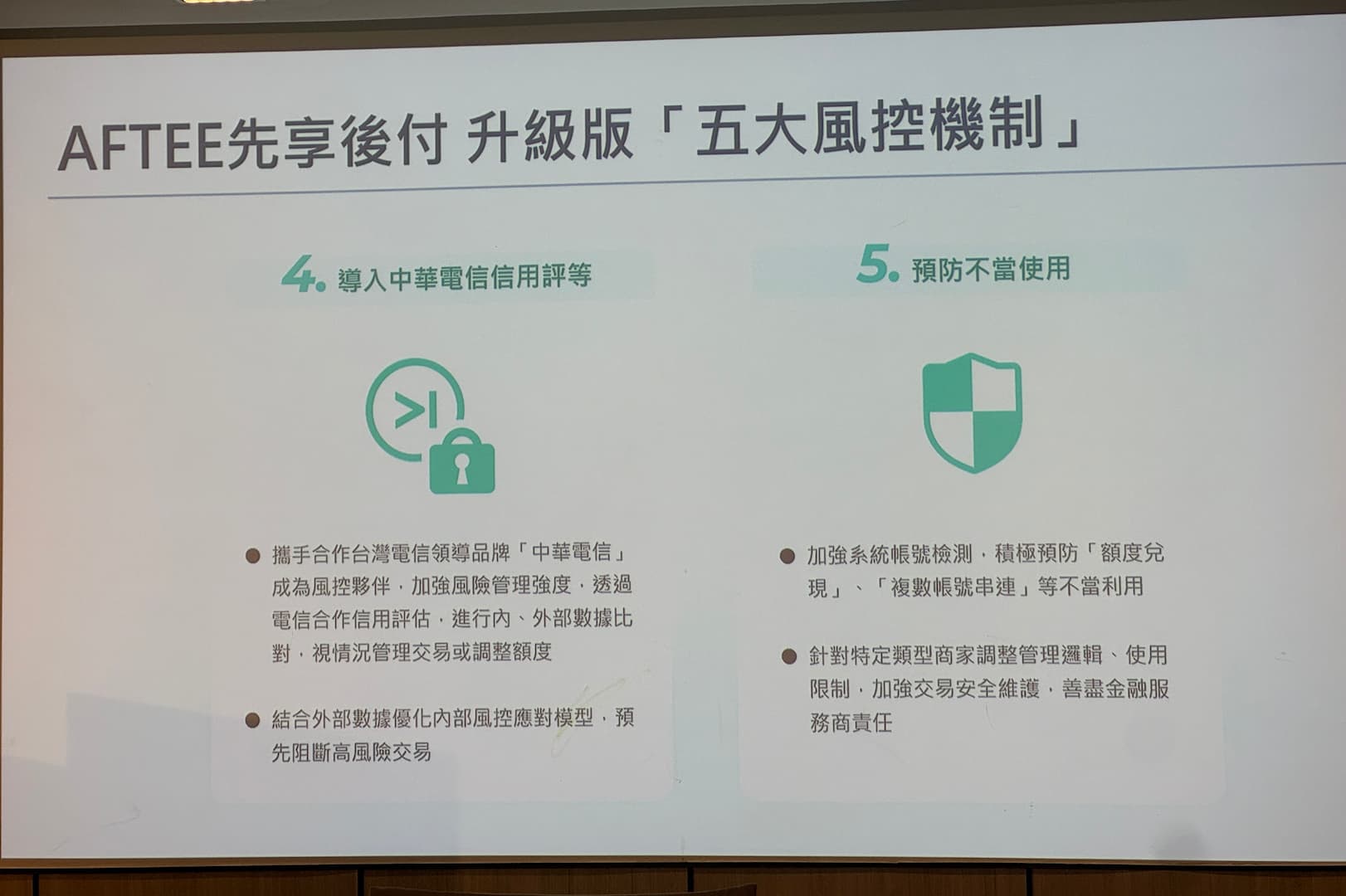 由於近年資安議題升溫,角元友樹表示,AFTEE 先享後付除目前的三大風控機制「客製化額度」、「動態額度管理」及「充分告知」外,新設「導入中華電信信用評等」與「預防不當使用」兩大機制,全面優化風控保護等級。