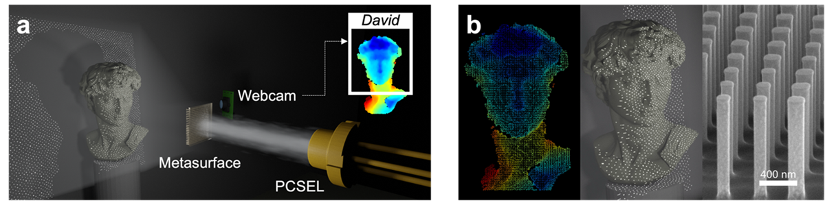 ▲ a:為鴻海研究院半導體所提出的深度感測系統設置示意圖。b:左起鴻海研究院半導體所系統繪製深度資訊圖、結構光投射於大衛石膏像示意圖、組成超穎介面的奈米微結構。(Source:鴻海)