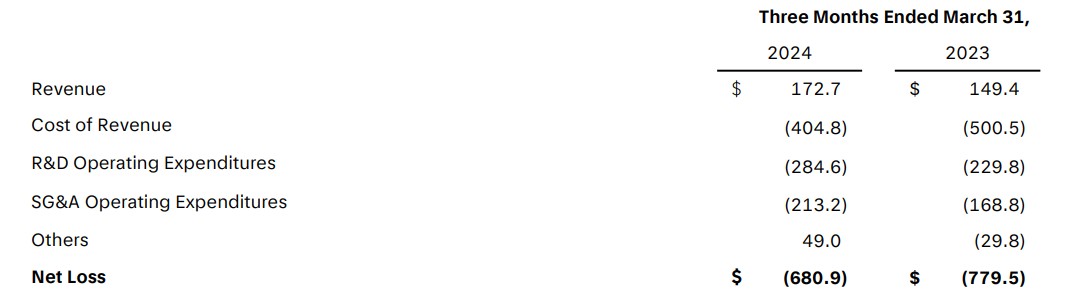 CNBC、MarketWatch等外媒報導,Lucid於5月6日美股盤後公布,2024會計年度第一季(1-3月),產量為1,728輛,交車量年增近四成至1,967輛,全年產量目標維持9,000輛不變。