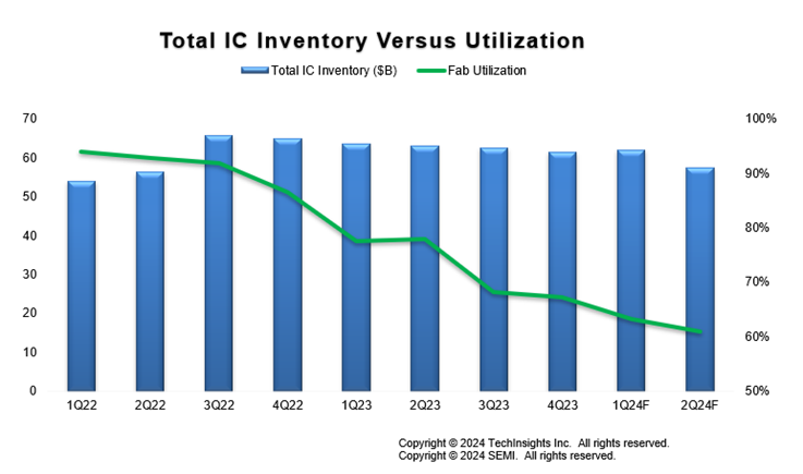 電子產品營收金額 2024 年第一季較 2023 年同期增加1%,2024 年第二季更較 2023 年同期成長 5%。IC 營收金額 2024 年第一季較 2023 年同期提升 22%、第二季高效能運算 (HPC) 晶片出貨量攀升和記憶體訂價繼續往上等助力推波助瀾下,可望大漲 21%。IC 庫存水準到 2024 年第一季趨穩定,第二季也持續改善。