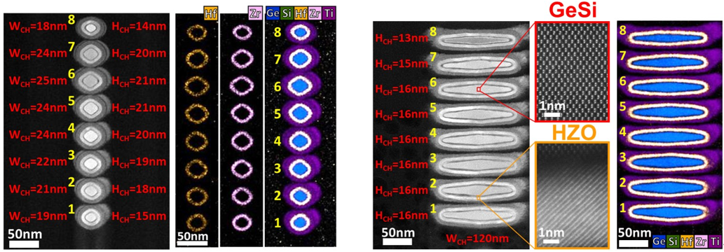 本研究團隊成功整合 Hf0.2Zr0.8O2 高介電係數 (κ=47) 介電層於八層堆疊 Ge0.95Si0.05 nanowires (圖六左) 與 nanosheets (圖六右),其研究成果發表於 2023 VLSI [11]。Nanowires 與 nanosheets 在 VOV=VDS=0.5V 時分別具有 9200μA/μm per footprint 與 360μA per stack 之驅動電流 ( nanosheets 擁有紀錄之驅動電流)。此外透過模擬確認 HZO在[Zr]=80% 可擁有介電係數之峰值,並模擬驗證高介電係數閘極堆疊結合高層數堆疊通道能有效降低閘遲延 (gate delay)。