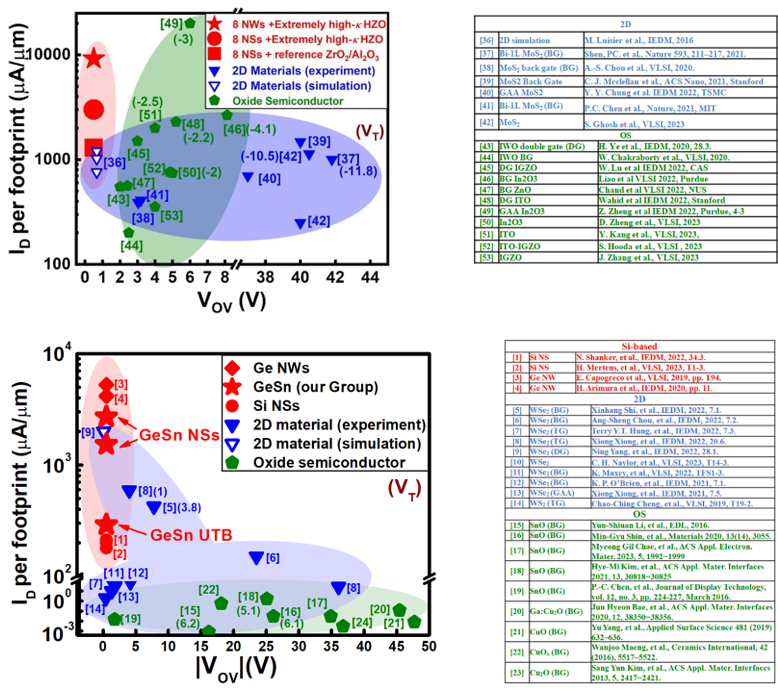 [11] Y.-C. Liu et al., “Extremely High-k Hf0.2Zr0.8O2 Gate Stacks Integrated into Ge0.95Si0.05 Nanowire and Nanosheet nFETs Featuring Respective Record ION per Footprint of 9200μA/μm and Record ION per Stack of 360μA at VOV=VDS=0.5V,” IEEE Symposia on VLSI Technology and Circuits (VLSI), T16-4, 2023.