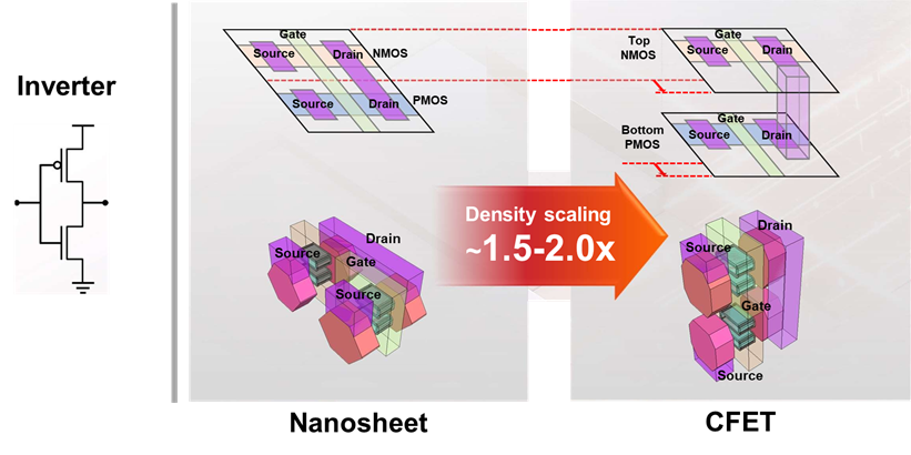 ▲ 圖八:互補式堆疊電晶體示意圖,進一步減少反相器單元的佔地面積(最多可減少至原先面積的一半) [4]。© IEEE