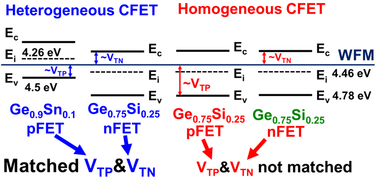 ▲ 圖十二:藉由異質鍺錫與鍺矽通道之間的能帶偏移可完成 VT 匹配之反相器[17]。© IEEE