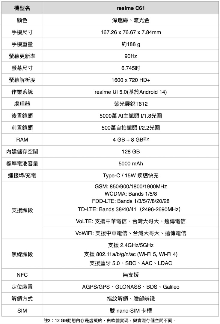 realme C61 提供「流光金」、「深邃綠」兩色,記憶體容量 4 GB+128 GB,售價為 3,990 元。