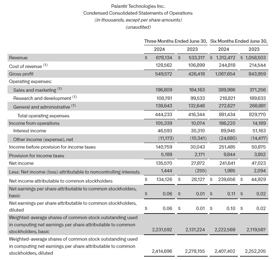CNBC、MarketWatch等外媒報導,Palantir於8月5日美股盤後公布,2024會計年度第二季(4-6月),營收年增27%(季增7%)至6.78億美元,優於市場共識值6.53億美元。經調整每股盈餘為9美分,優於分析師預估的8美分。