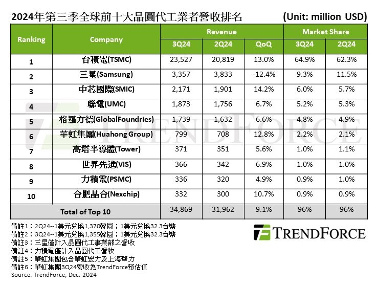 TrendForce表示,第三季前十大晶圓代工營收排名未有變動,台積電以近65%市占率穩居第一名。智慧手機旗艦新品、AI GPU及PC CPU新平台等HPC產品齊發,驅動台積電第三季產能利用率與晶圓出貨量提升,營收季增13%到235.3億美元。