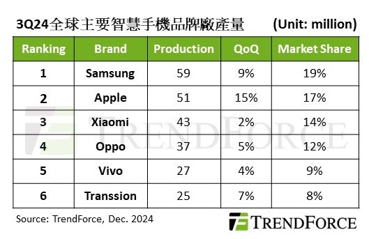 蘋果第三季手機產量約5,100萬支,季增15 %,以近17%市占率居第二名。第四季蘋果進入新機生產高峰,市占排名將躍升全球第一。新機AI話題未能在中國引起迴響,加上品牌競爭激烈,導致中國銷售表現較去年同期衰退。