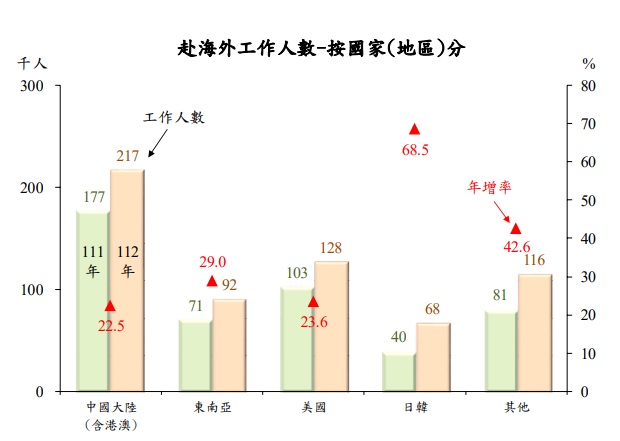 值得注意的是,112年赴美工作人數12.8萬人,改寫歷史新高紀錄,主計總處國勢普查處副處長譚文玲表示,這與台積電前進美國亞利桑那州設廠有直接關聯。