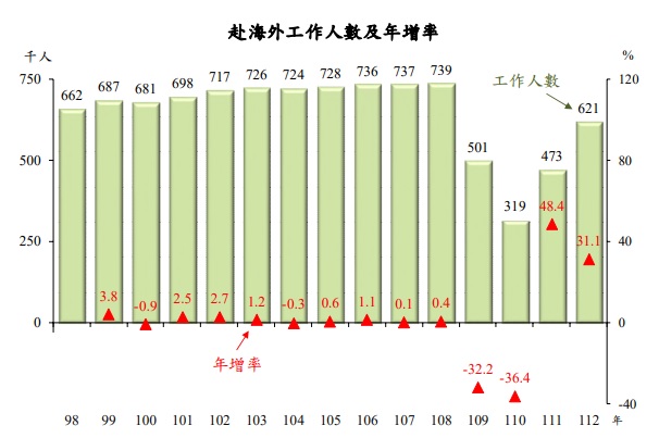 隨疫情影響弱化,111年及112年人數持續增加,但仍未回復疫情前水準,112年國人赴海外工作人數計62.1萬人,年增14.8萬人。
